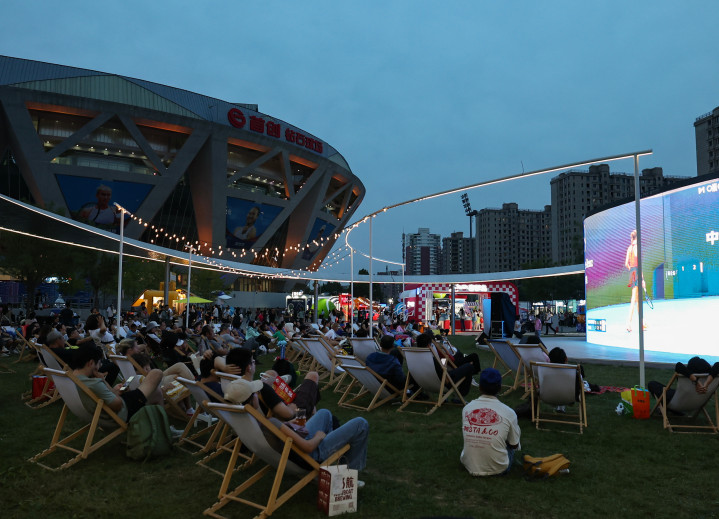 10月1日,旅客在国度网球中心内的大屏前不雅看比赛。新华社记者 杜昕怡 摄