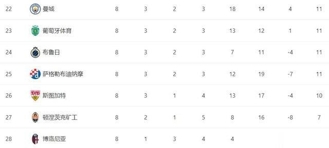 很挑升旨兴味,相同是第一轮,萨格勒布迪纳摩也输了7个球,他们2:9不敌拜仁。于是后头几轮,萨格勒布迪纳摩也像国足一样,带着清静净胜球债,跑东跑西。不外萨格勒布迪纳摩后头打得其实还可以,这也使得他们最终尽然能和曼城同分。但问题是,你前边净胜球欠得太多,后头就算竭力还债,照旧远远不够,这就变成了一个凄惨以致上升的事实——萨格勒布迪纳摩,因为净胜球的瑕疵,排在了25名,刚巧刚刚挡在了附加赛的门外。