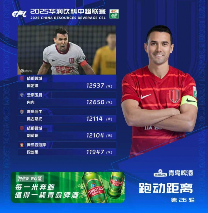 排在周定洋之后的是云南玉昆外助内内和青岛海牛外助奥古斯托,同期周定洋的队友胡荷韬在本轮跑动榜上位列第4位,而榜向前4位的跑动距离齐高出了1.2万米。